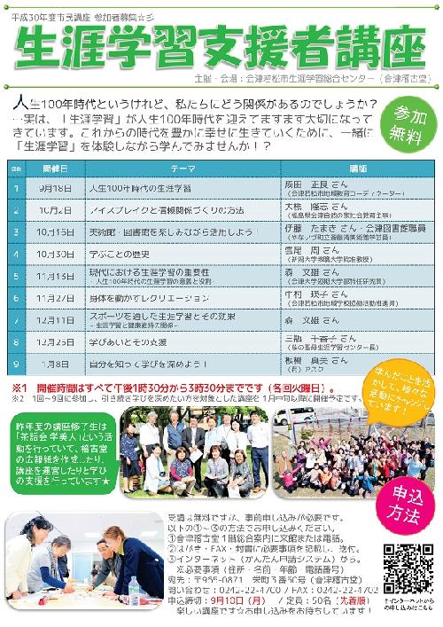| 2018年9月22日(土) | あいづまちなかキャンパス(定員に達しました) | 09:30 ~16:00 | 生涯学習総合センター多目的ホール | 生涯学習総合センター(會津稽古堂) 担当:主任主事兼社会教育主事 南雲 誠 電話:0242-22-4700 FAX:0242-22-4702 | |