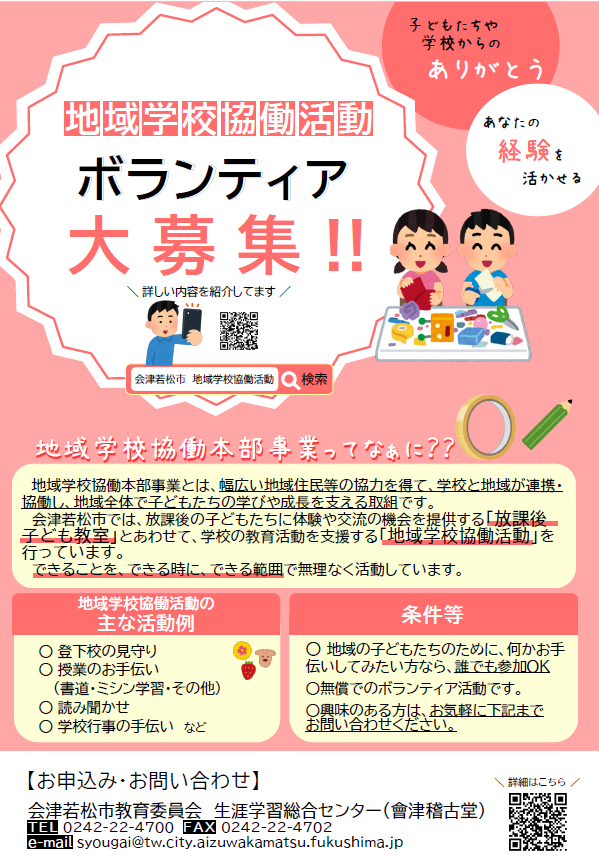 - 会津若松市では地域学校協働活動に協力していただけるボランティアの方を募集しています。