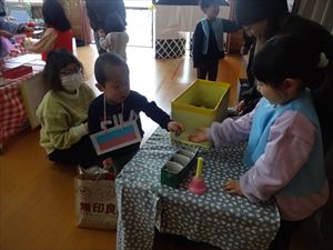 お買い物に来た各クラスの子どもたちに優しく対応しながら、はりきって品物を売っていたぞう組さん。