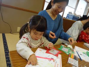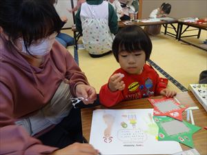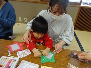 保護者の方にはお子さんの手形、足形を使用した作品作りを。お子さんは小さなシールを貼ったり、サンタのシールを貼り、クリスマス写真飾りを作りました。