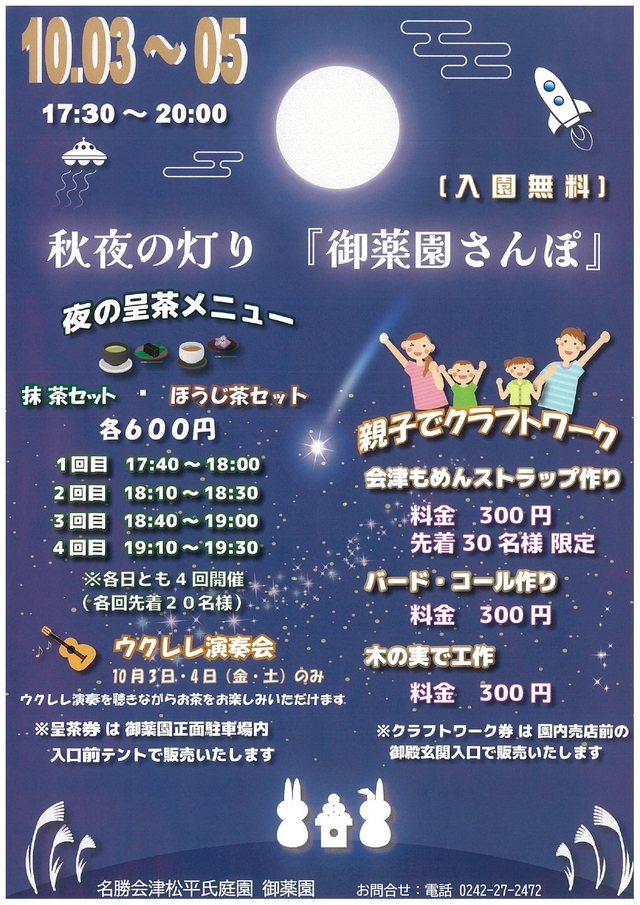 毎年恒例の国指定名勝会津松平氏庭園「御薬園」秋季ライトアップを今年も開催します。
