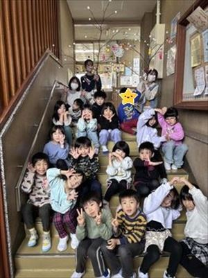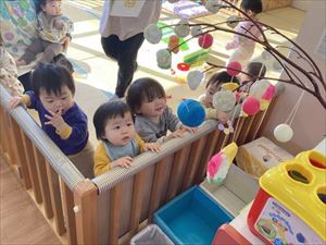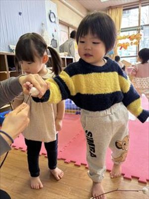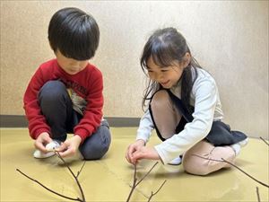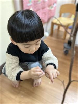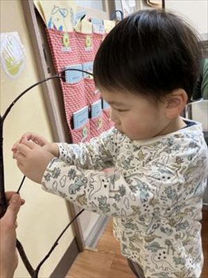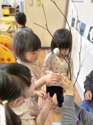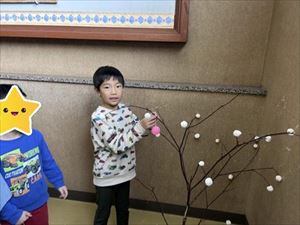 一年が良い年になるよう願いながら、だんごをみずきの木に刺して保育所内に飾りました。だんごさしの飾りで、とても華やかな雰囲気に包まれました。