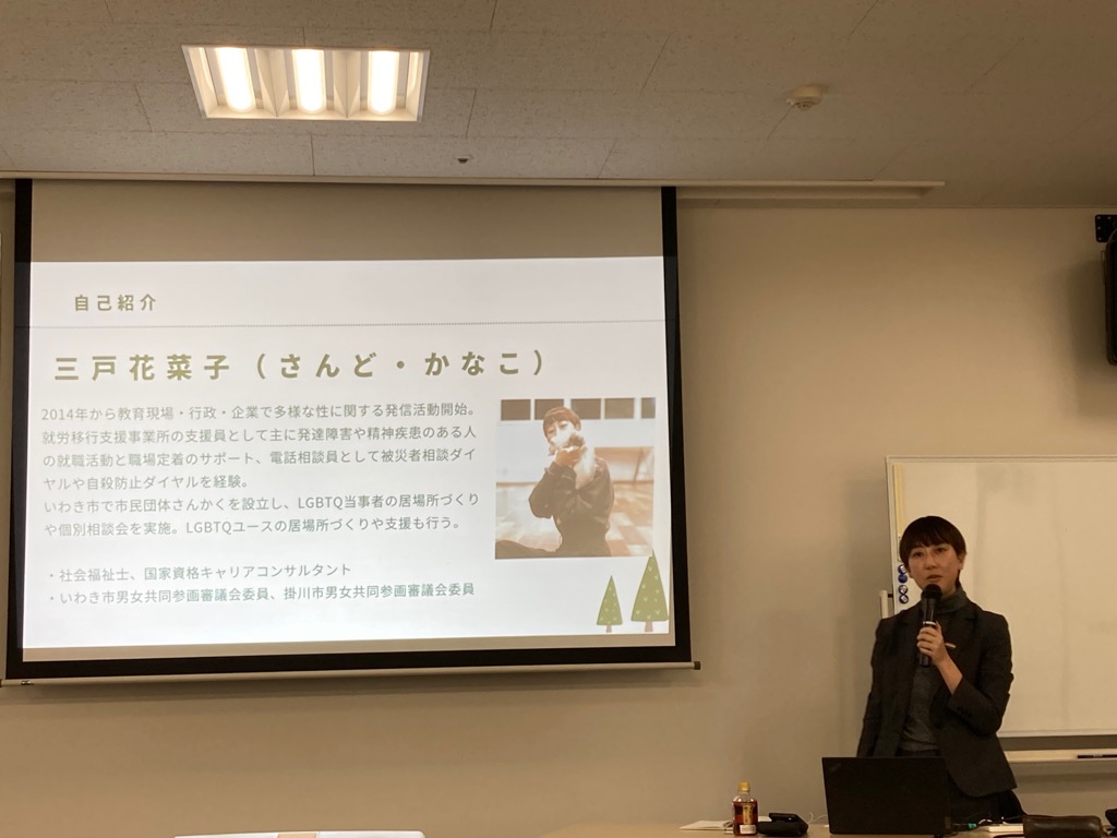 令和7年11月22日(土)に、いわき市で性的マイノリティの方々の相談支援等を行っている市民団体「さんかく」代表の三戸花菜子氏を講師にお招きし、標記セミナーを開催しました。