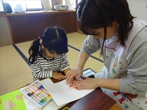 お子さんと一緒にのり付けしたり、シールを張ったりしながら素敵な作品を仕上げていただきました。