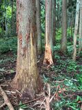 - 熊 は ぎ:スギやヒノキの樹皮を剥がす行為です。樹皮が残り、甘皮部に歯で削いだ痕が残るのが特徴です。