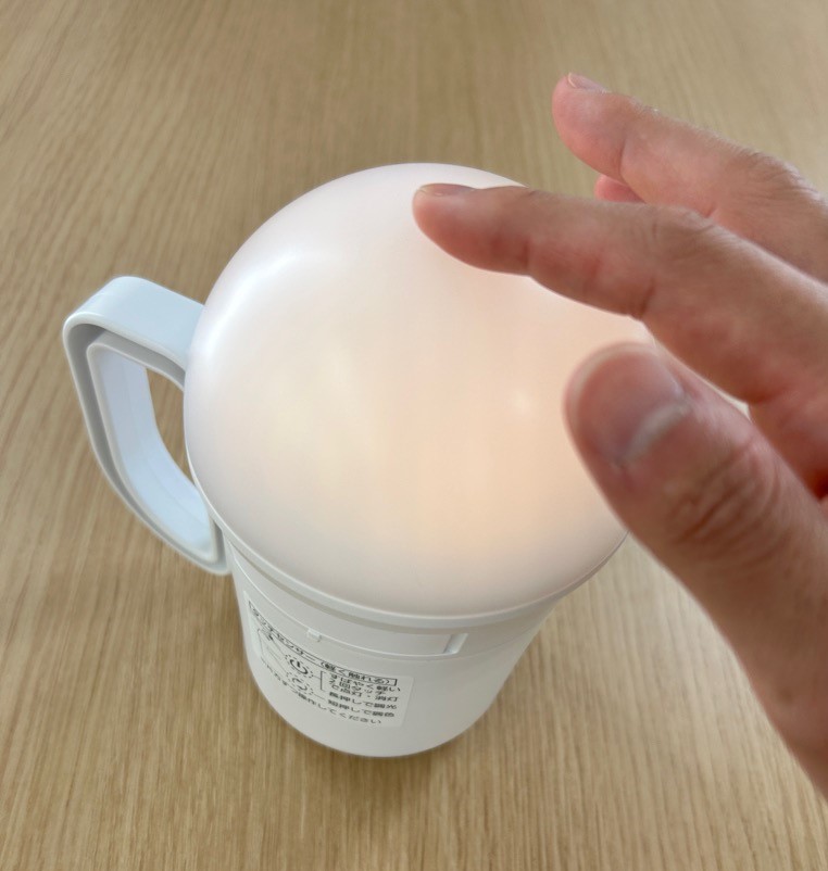 点灯と消灯はランタンの頂点に触れるだけで操作できます。また、持ち手がついているので、懐中電灯のように使うことも可能です。