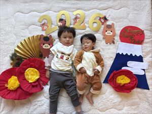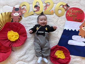 「お昼寝アート」では、ねんねの赤ちゃんを小物などで飾ったマットなどに寝かせたり、座って写真を撮ります。「2026年お正月」をテーマにして撮影をしました。かわいいお顔の記念の1枚が撮れましたよ。
