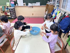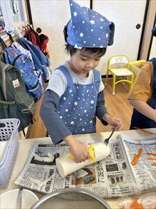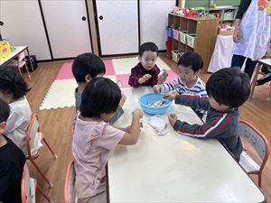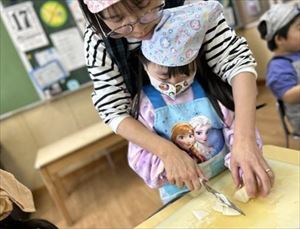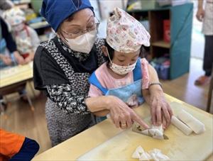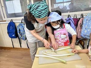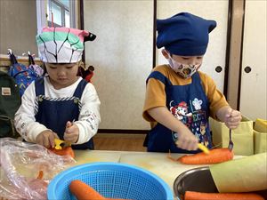 切ってくれました。3、4歳クラスのお友達も野菜を洗ったり、皮をむいたりをしてくれました。