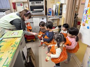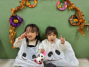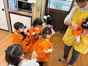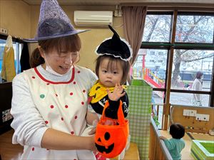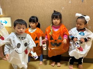 令和7年10月31日(金)保育所内でハロウィンパーティーを開催しました。世の中的にも認知されてきたハロウィン!子どもたちもパーティーを楽しみにしており、クラスごとに衣装やバックを手作りしました。