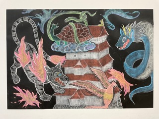 - 作品を通して伝えたいこと:四神隊は会津戦争の際に会津城(鶴ヶ城)を守護したため、それをイメージして、城を四神が守っている様子にして描いた。