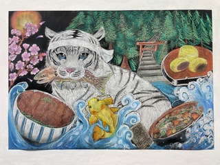 - 工夫した点・苦労した点:自然物や手の質感を細かく再現しつつ、色のバランスや迫力のある構図を考えて描き上げることができた点。すごろくのコマを黒板にしたことで、チョークそのものの質感を生かすことができ、全体的に立体感を出すことができた点。