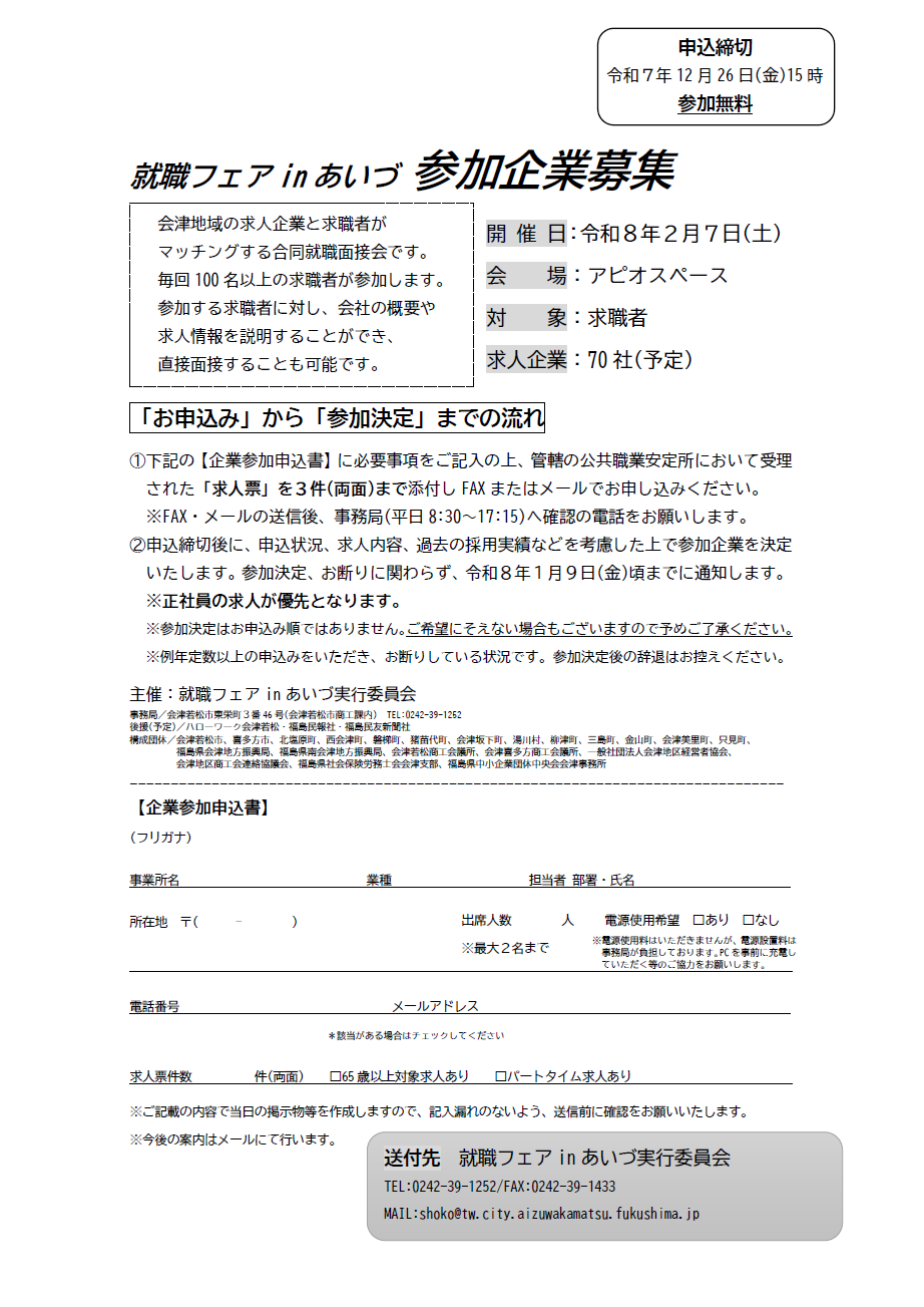就職フェアinあいづ実行委員会(市商工課内)へメールかFAXでお送りください。