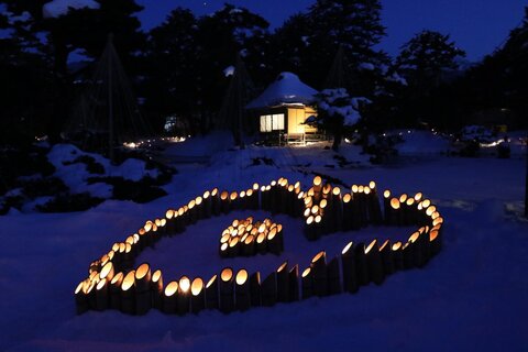 ろうそくのあかりに照らされて雪景色に浮かぶ会津幻影をお楽しみください。