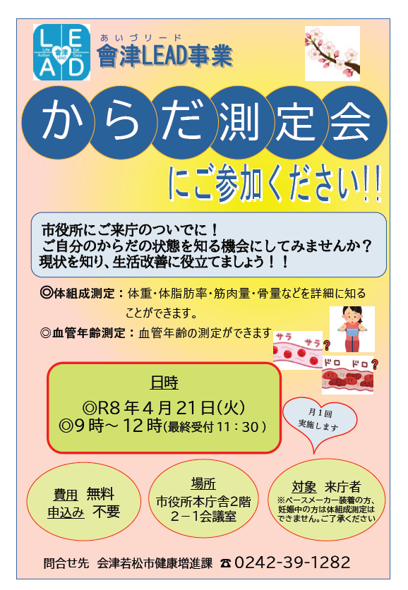 本庁舎に来庁された際に、気軽に体組成と血管年齢を測定していただけます。ご自身のからだと向き合う機会としてみませんか。
